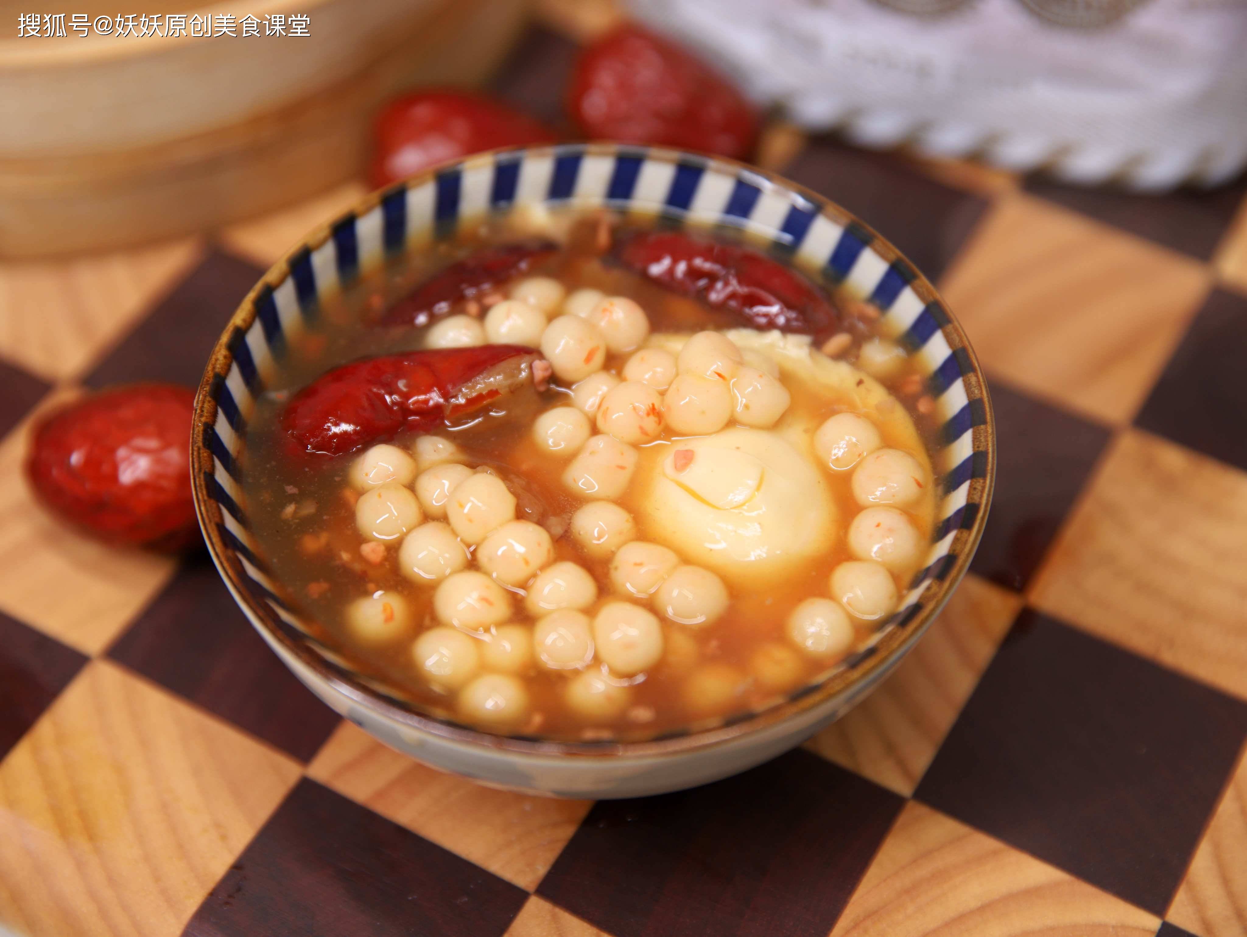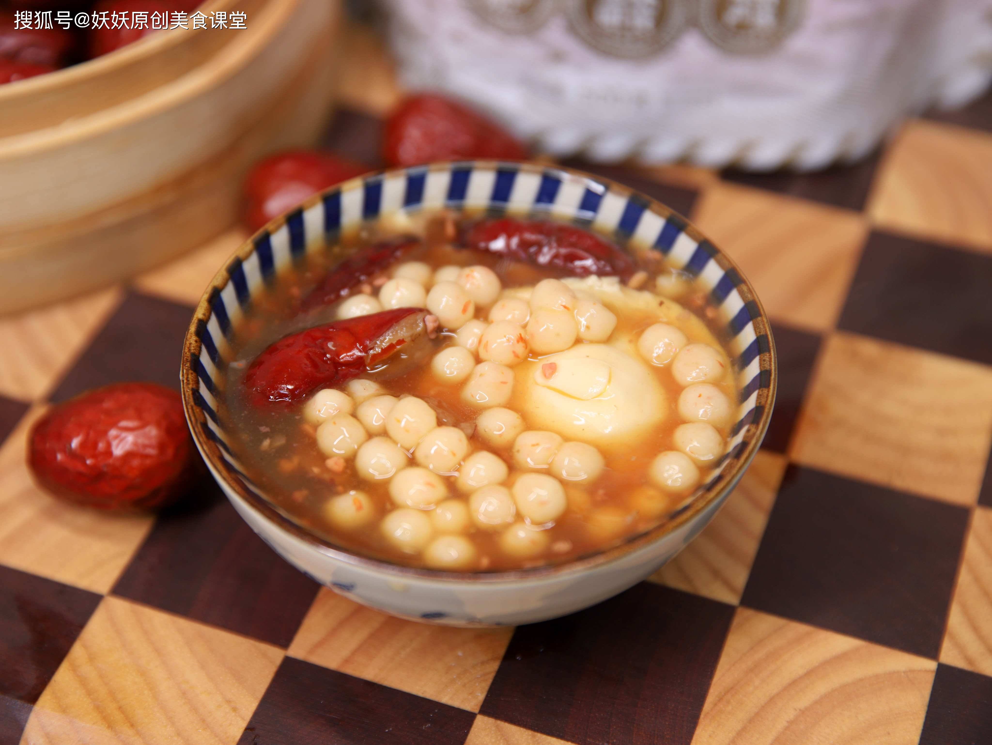 用料:红枣7颗,鸡蛋两个,玫瑰酒酿三勺,黄芪少许,酒酿小圆子适量,红糖适量,水淀粉半碗。
