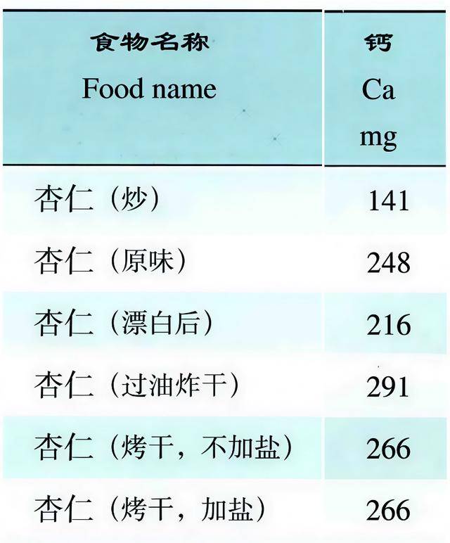 不同加工方式的杏仁钙含量差异较大,每 100 克含量在141~291毫克不等,是牛奶(107mg/100g)的 1~3 倍。虽然吸收率不如牛奶,但胜在量大,为不爱喝牛奶或乳糖不耐受的人群提供了一个美味的补钙新选择。