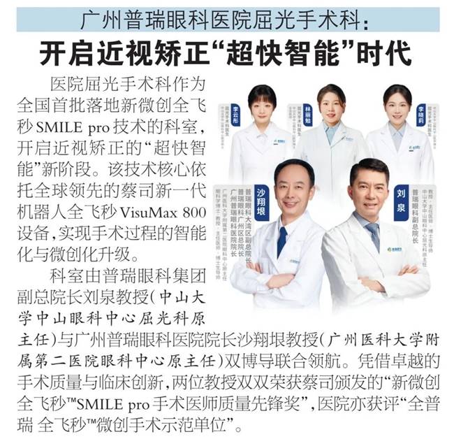 这支"明星专家团队"构成了医院强大的医疗与技术基石。同时,医院的综合实力也获得了行业与媒体的高度认可,近期荣登"2025年第五届广东医院高水平专科巡礼-广州日报最强科室推荐"名单,并获评"广东省科普志愿服务试点基地"。这些荣誉共同印证了广州普瑞眼科医院在眼科专科建设上的领先地位。