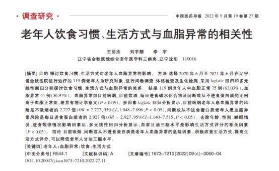 [1]王丽杰,老年人饮食习惯、生活方式与血脂异常的相关性,2022-09-25