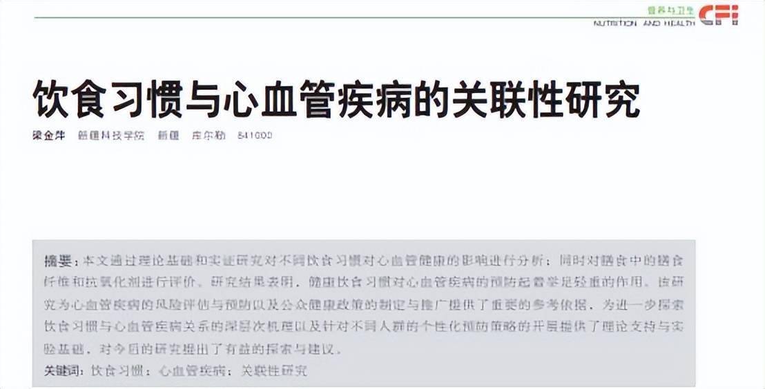 [1] 梁金萍.饮食习惯与心血管疾病的关联性研究[J].中国食品工业,2024
