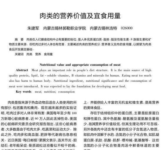 [1]朱建军.肉类的营养价值及宜食用量[J].肉类工业,2015
