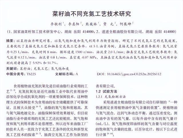 菜籽油不同充氮工艺技术研究 李敏利 ,李名阳 ,熊巍林 ,贾 元 ,何展坤 粮食科技与经济 2025-05-20