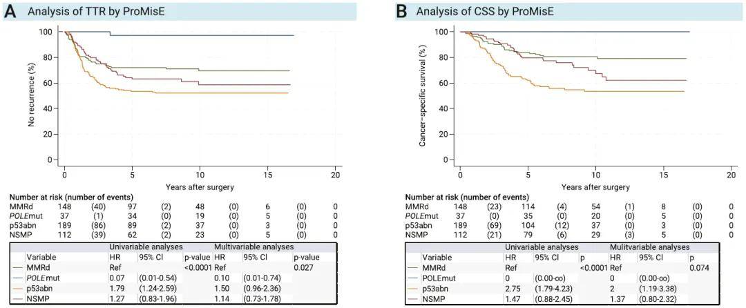 单因素分析显示,ProMisE分子分型与TTR显著相关(P*< 0.0001);多因素分析中,该相关性仍具有统计学意义(P= 0.027)(图1A)。单因素分析中,ProMisE分子分型与CSS显著相关(P < 0.0001),但在多因素分析中,该相关性无统计学意义(P = 0.074)(图1B)。POLE突变型肿瘤患者预后良好,37例患者中仅1例出现复发,且该患者在初次手术后12年仍存活。单因素及多因素分析均显示,p53异常型肿瘤患者预后较差(图1A、B)。多因素分析结果表明,FIGO分期、组织学类型及分级、年龄、淋巴管间隙浸润(LVSI)以及盆腔淋巴结清扫术均与TTR和CSS显著相关。辅助治疗可显著改善患者的TTR和CSS,且在单因素和多因素分析中均具有统计学意义。