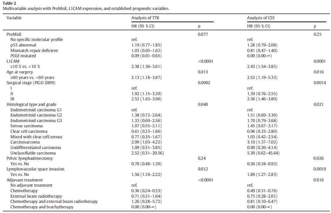 单因素及多因素分析均显示,L1CAM高表达与更短的TTR及CSS相关(P< 0.0001;图2A、B)。无论ProMisE分子分型亚组如何,L1CAM高表达的患者预后均较差,且在p53异常组和NSMP组中,该差异具有统计学意义(图2C-J)。在同时纳入ProMisE分子分型、L1CAM表达水平及已知预后变量的多因素模型中,ProMisE分子分型的统计学意义消失,而L1CAM表达水平仍具有显著统计学意义(表2)。