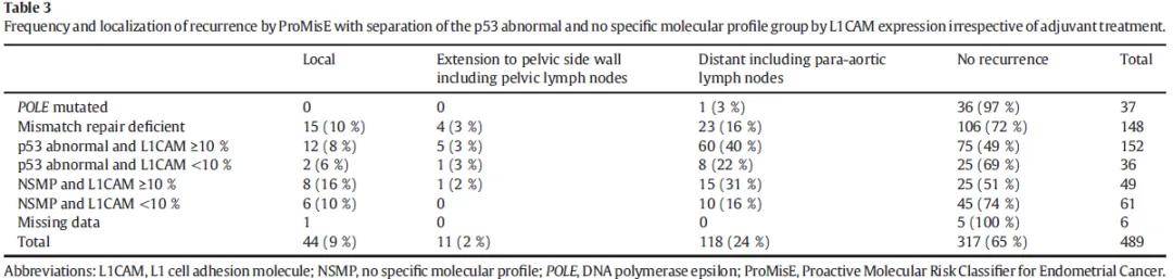 在仅接受化疗且未接受放疗的辅助治疗患者中,357例中有113例(32%)出现复发。所有亚组的局部区域复发率均较低。p53异常组及L1CAM高表达的NSMP组患者远处复发率较高。对于未接受辅助治疗的Ⅰ/Ⅱ期MMRd组和NSMP组患者,远处复发率为10%(5/52),而阴道复发率为29%(15/52)。