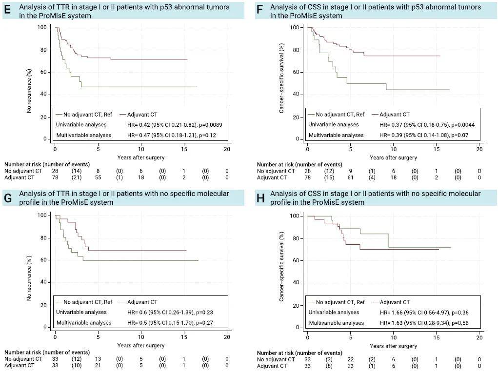 依据机构诊疗指南,大多数Ⅲ期患者接受化疗。具体而言,210例Ⅲ期患者中,173例(82%)接受辅助化疗,仅2例(1%)接受辅助放化疗。279例FIGO Ⅰ/Ⅱ期患者中,85例(30%)未接受辅助治疗,184例(66%)接受辅助化疗,其余10例(4%)接受辅助放疗或放化疗。按ProMisE分子分型亚组分层分析显示,辅助化疗可显著延长MMRd组和p53异常组患者的TTR并改善CSS,且在单因素和多因素分析中均具有统计学意义;但在POLE突变组和NSMP组中,未观察到辅助化疗的获益(图3)。