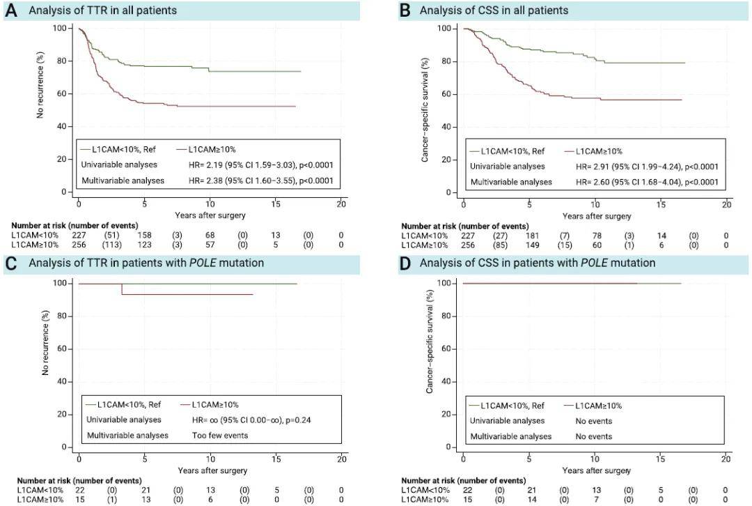 在这项纳入大样本高危患者的队列研究中,L1CAM表达水平与手术分期、LVSI、手术时年龄、组织学类型及分级、辅助治疗方案、盆腔淋巴结分期清扫术均为强效预后因素。在TTR和CSS的单因素分析中,ProMisE分子分型具有统计学意义;在TTR的多因素分析中,该分型也具有统计学意义,但这一意义仅在模型未纳入L1CAM表达水平时存在。在排除POLE突变型的MMRp肿瘤患者中,研究观察到p53异常与L1CAM高表达呈显著正相关,这与既往研究结果一致。本研究证实,无论在p53异常组还是NSMP组中,L1CAM表达水平均具有独立预后价值。p53异常且L1CAM高表达的患者远处转移发生率为40%,而p53异常且L1CAM低表达的患者远处转移发生率仅为22%。NSMP组中L1CAM高表达的患者占比相对较低,但该表达特征仍与较高的远处复发率相关。已有大量研究证实,L1CAM高表达与盆腔淋巴结转移及远处转移密切相关。本研究队列中患者的盆侧壁复发率较低,这可能与大部分患者均接受了淋巴结分期清扫术有关。远处转移患者预后极差,而阴道/盆腔中央区复发的患者通常可通过放疗实现挽救性治疗,尤其是在初次确诊时不伴高危因素的患者中,放疗疗效更为显著。正是由于L1CAM高表达的肿瘤具有较强的转移潜能,该指标才成为预测TTR缩短及CSS降低的主导因素。