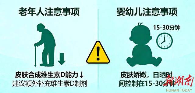 老年人皮肤合成维生素D的能力会下降,可能需要额外补充维生素D。可多食用深海鱼、鸡蛋、动物肝脏等食物。光过敏患者及正在服用磺胺类、喹诺酮类等光敏性药物的人最好严格防晒。凡患有出血性疾病、较重的心脏病、尿毒症、活动性肺结核等严重疾病者不宜多晒太阳。婴幼儿因皮肤娇嫩,日晒时间应适当缩短,并要避免阳光直射脸部。