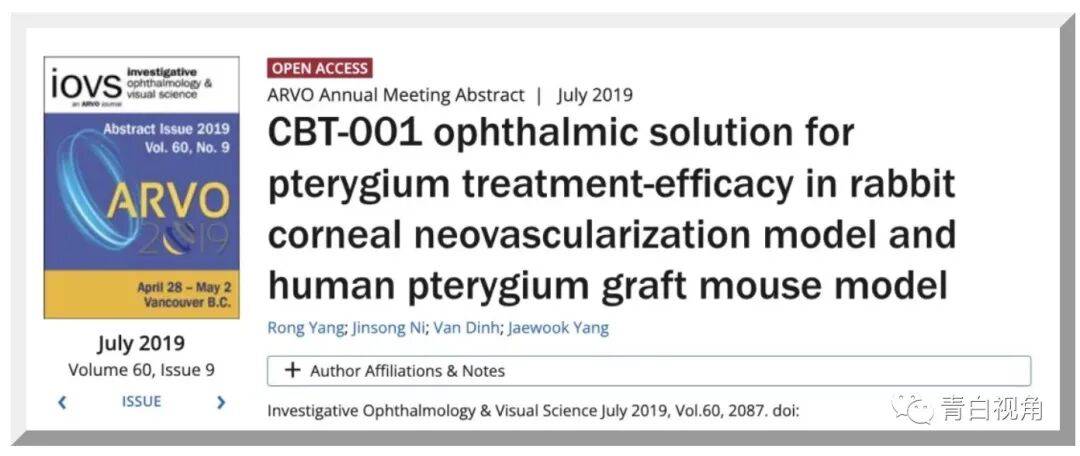 笔者通过文献寻找一些公开的研究数据,查询到2019年该公司在ARVO年会上曾公开发表了CBT-001动物实验的研究摘要。研究结论表明:CBT-001 在兔眼模型中以剂量依赖性方式抑制角膜新生血管形成。CBT-001 消退了生长在免疫缺陷小鼠角膜上的人类翼状胬肉病变,首次证明了小分子药物在此模型中的功效。结果表明 CBT-001 具有治疗翼状胬肉的潜力。