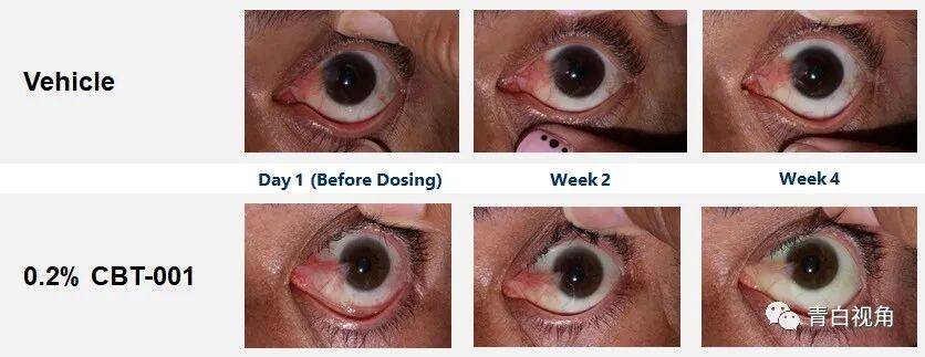 从下图看,0.2%CBT-001相比安慰剂组的第四周治疗效果是非常明显的。