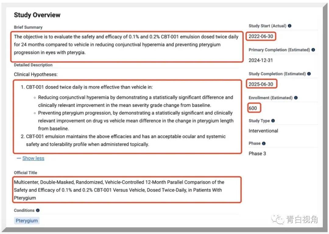 2022年6月,CBT-001已在美国正式启动翼状胬肉与相关充血症状的III期临床试验(NCT05456425),这项多中心、双盲、随机、平行组、安慰剂对照实验,目的是评估与安慰剂相比,每天两次滴用 0.1% 和 0.2% CBT-001 制剂,持续 24 个月,在减少翼状胬肉眼结膜充血和预防翼状胬肉进展(抑制病变长度增加)方面的安全性和有效性。研究将招募600位患者,计划2025年年中结束。