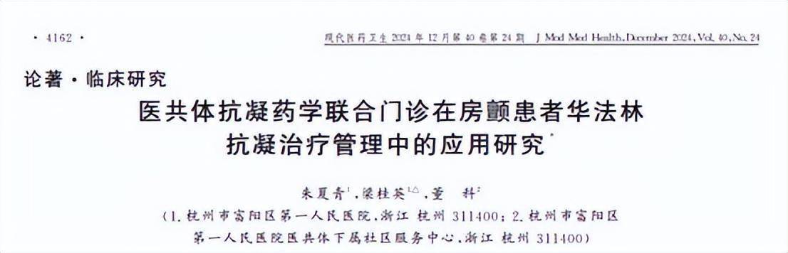 [1] 朱夏青.医共体抗凝药学联合门诊在房颤患者华法林抗凝治疗管理中的应用研究,现代医药卫生,2024-12-30