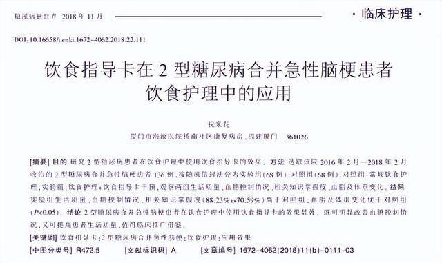 [1]祝米花.饮食指导卡在2型糖尿病合并急性脑梗患者饮食护理中的应用[J].糖尿病新世界,2018,