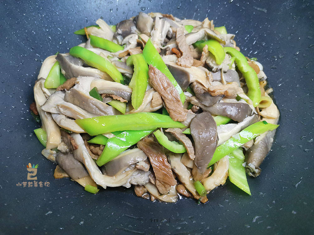 4、起锅放油,热一会儿,先把肉倒在里边,扒拉至变色后,往里边调入酱油,葱花,少许醋,炒香后,把平菇和尖椒都倒里边。继续炒一会儿,彻底熟透,补些许盐,把味道调到适宜后盛出。