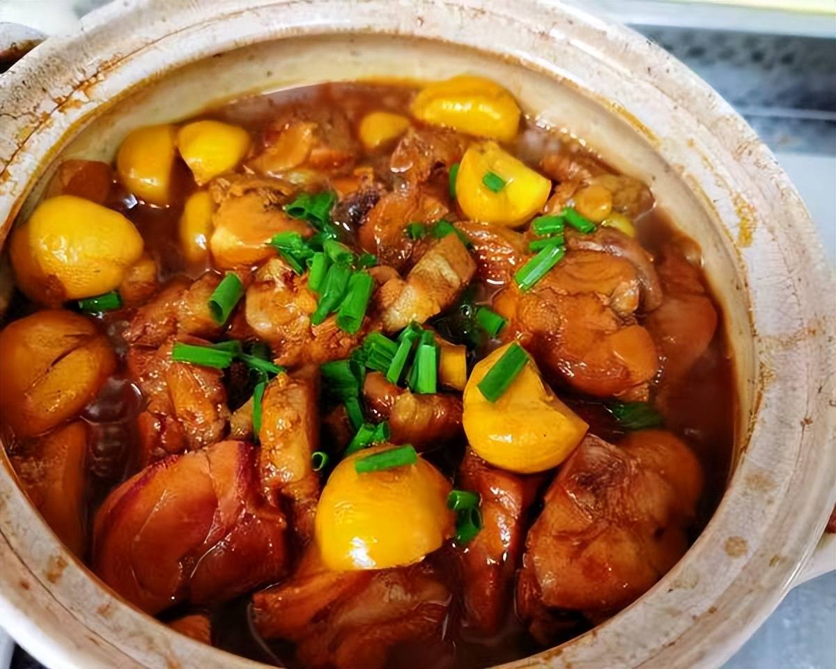 5、往里边加点生姜和葱,板栗也放里边,与之一起炖一个钟头,接着往汤汁里补点盐,火候大一些,再过二十分钟即可。