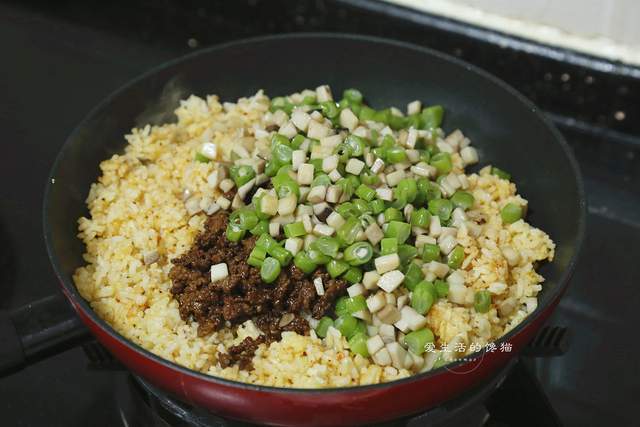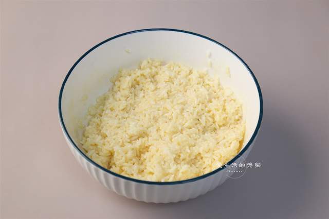 米饭煮熟后放凉,加入鸡蛋抓匀,最好冷藏一下,炒出来的饭粒会更干爽好吃。
