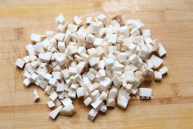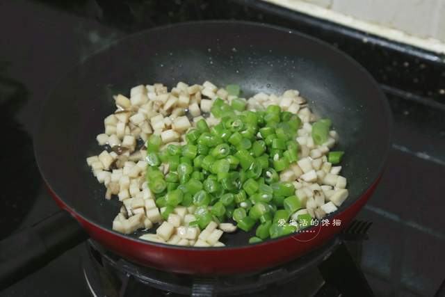 热锅倒入适量的油,放入杏鲍菇炒软再加入四季豆粒炒熟,加入少许盐调出底味铲出锅。