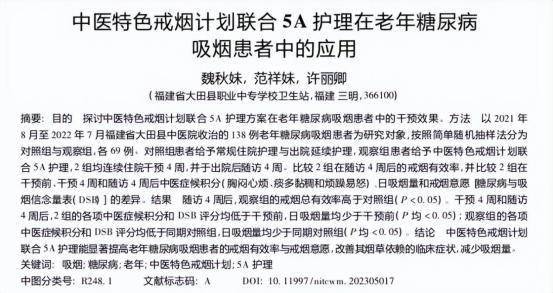 [1]魏秋妹.中医特色戒烟计划联合5A护理在老年糖尿病吸烟患者中的应用[J].中西医结合护理(中英文),2023