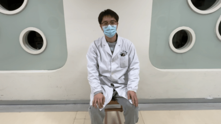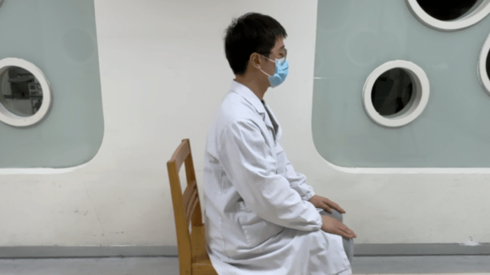 同样端正坐好,左手拉住座椅后缘,右手下压固定左侧锁骨。这次,头向右侧屈后,向左上方旋转,目光看向左上方的天花板。