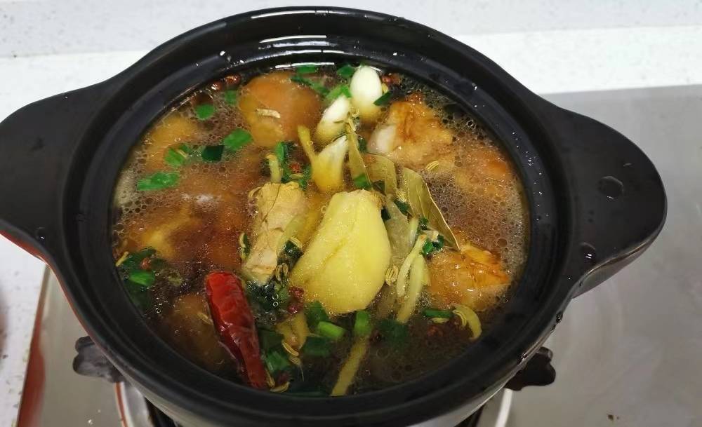 4、倒在砂锅里边,添上热水浸没,再放几样香料,把汤汁煮到沸腾后,转为文火去焖。