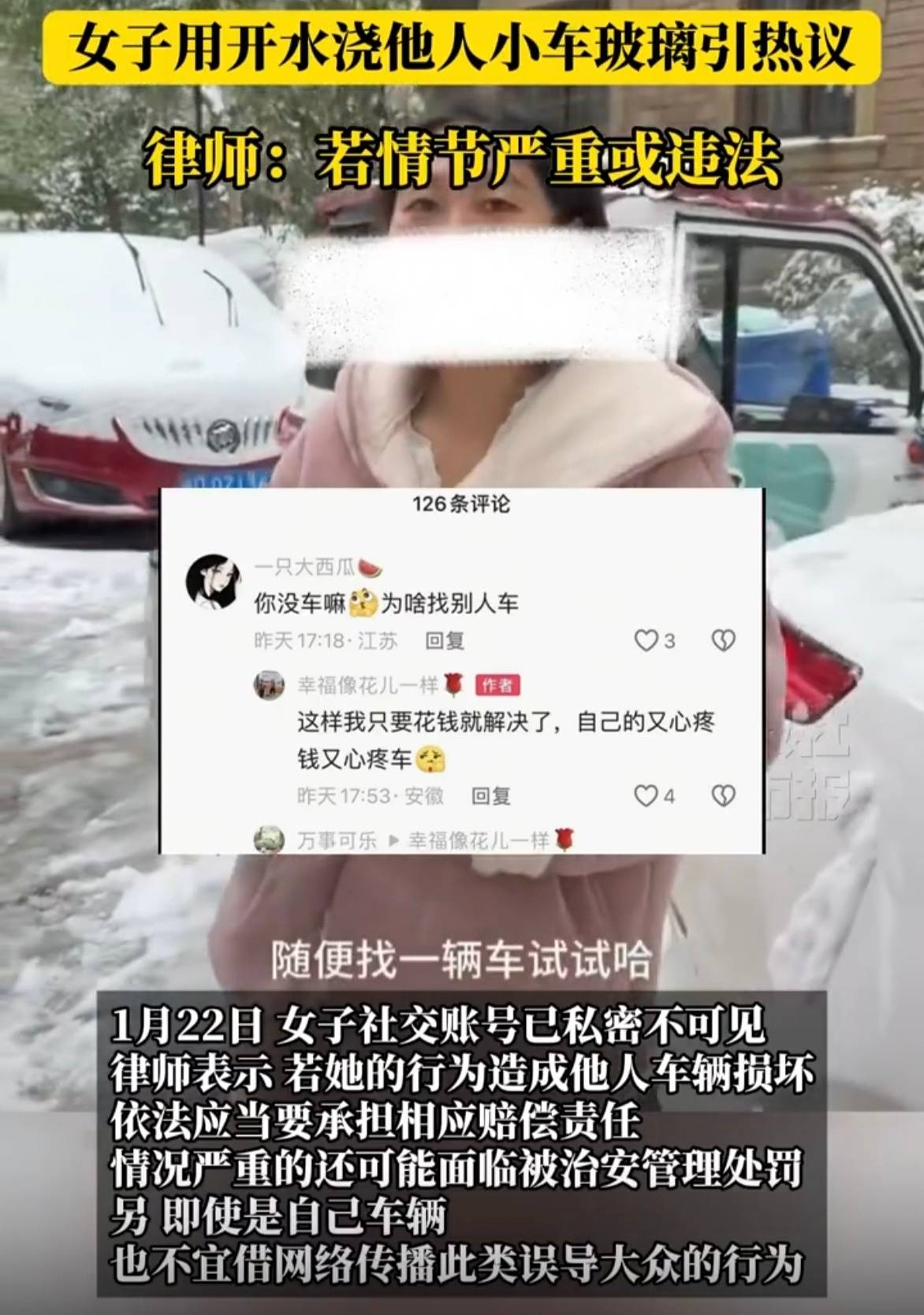 1月22日,原视频被删除,涉事女子社交账号也设为私密状态。随着争议发酵,女子改口澄清,称视频中的车辆并非陌生人的,而是其妹妹的车。但这一说法与她视频中“随便找的车”、早期标注的“自家车辆”完全矛盾,前后说辞反复,让事件更显扑朔迷离。有网友曝光,女子曾在评论区回应为何不用自己的车测试,直言“用别人的车出了事花钱就能解决,用自己的车心疼”,这番言论更让网友怒火中烧。