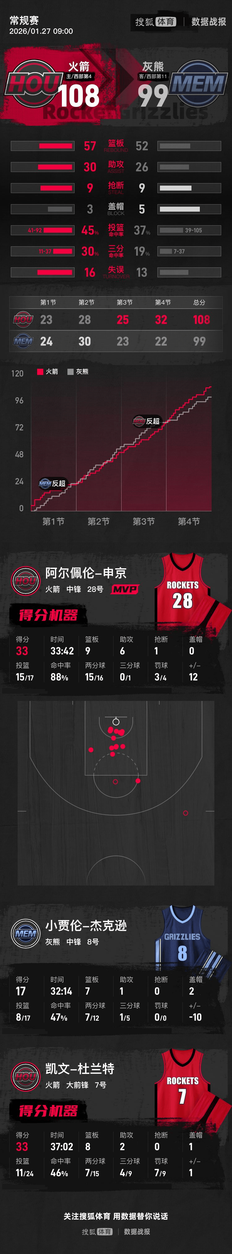 【搜狐体育战报】北京时间1月27日NBA常规赛,主场作战的火箭以108-99击败灰熊。申京33分9篮板6助攻,阿尔达马17分7篮板2助攻。