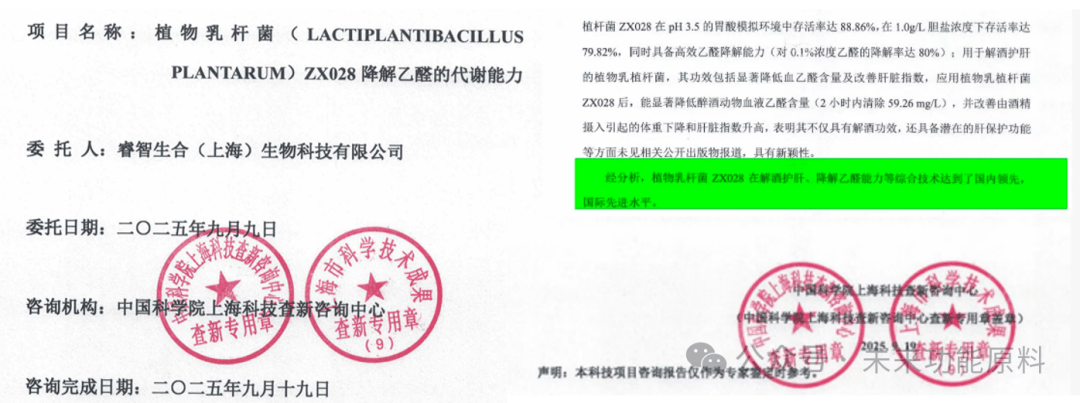 经中国科学院相关查新机构出具的专业查新报告认定,睿智生合(核心专利菌株——植物乳杆菌ZX028,其在“解酒护肝与降解乙醛”方面的综合技术水平已达到国内领先、国际先进水平。