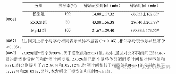 植物乳杆菌ZX028组已醉小鼠整体醉酒耐受时间相对模型组和英国解酒神药组分别提升了212.86%和102.12%。