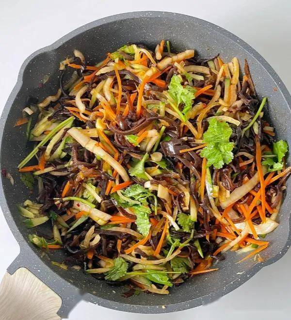 教你个绝妙的吃法:木耳泡发后焯水,加黄瓜丝、胡萝卜丝,用蒜末、醋、少许香油凉拌。脆生生的口感,酸辣开胃,下饭又养生。泡木耳记得用冷水,热水会破坏胶质。
