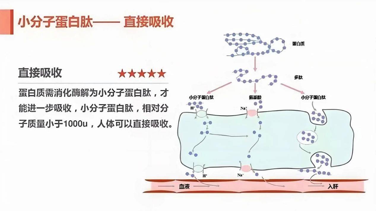 1. 高效吸收:小分子肽,平均分子量在1000道尔顿以下,无需消化分解,可以直接被小肠吸收,最终经人体细胞、组织、器官及血液大循环供身体各功能所用。2. 以完整的形式吸收:人体服用小分子肽时,不会受到人体中的促酶、胰酶、淀粉酶、消化酶、胃蛋白酶及消化系统中的酸碱物质的损害或二次水解,小分子活性肽是以完整的形式被人体吸收和利用的。