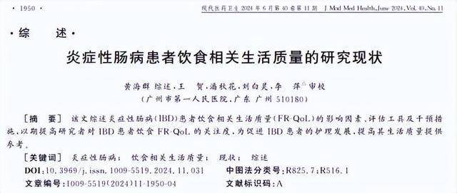 [1]黄海群.炎症性肠病患者饮食相关生活质量的研究现状,现代医药卫生,2024-06-15