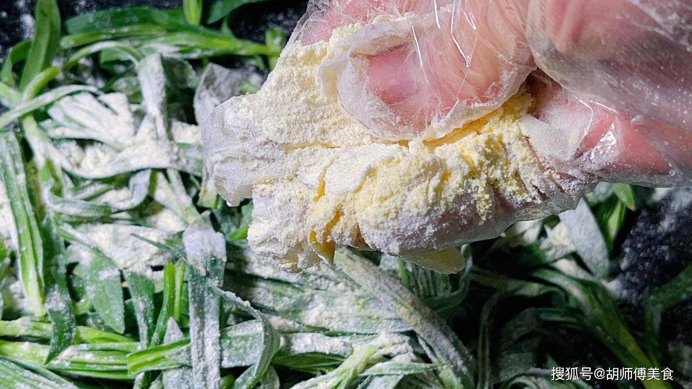 第三步:将玉米面、面粉混合在一起搅拌均匀,然后慢慢的撒到面条菜中,直到每颗面条菜表面都裹上一层薄薄的粉即可,粉不可裹厚,否则会导致面条菜的口感不好。