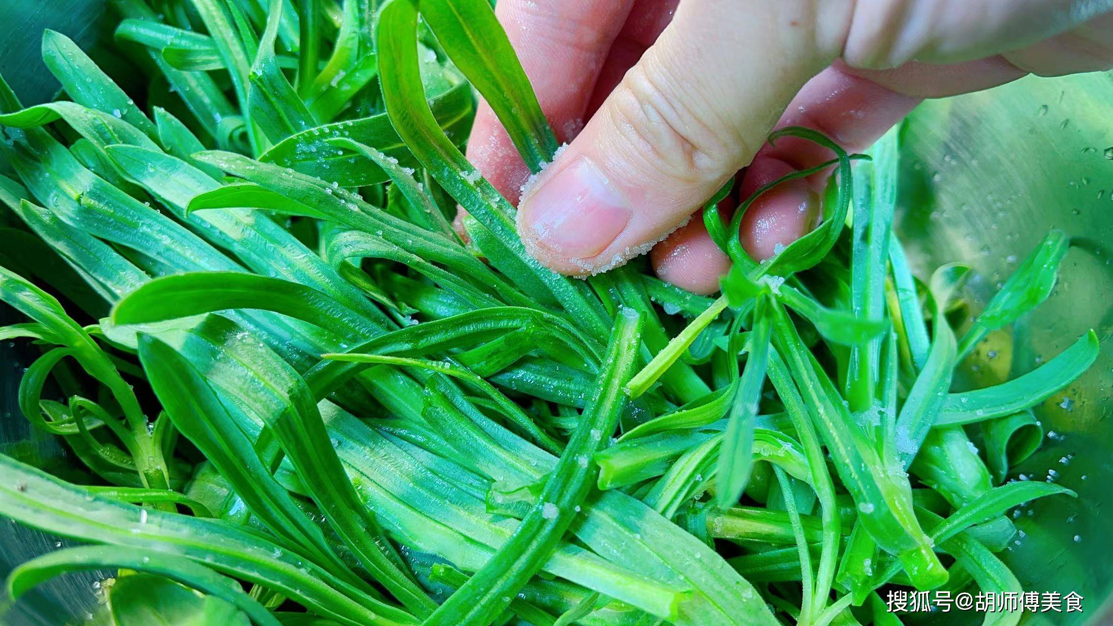 第一步:将面条菜比较的茎摘的扔掉,然后将面条菜放入淡盐水中浸泡10分钟,时间到后,将面条菜捞出,再用自来水将面条菜冲洗干净,接着再把面条菜表面的水沥干。