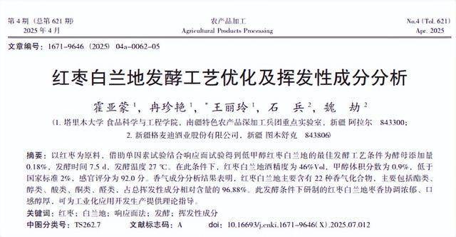 红枣白兰地发酵工艺优化及挥发性成分分析,霍亚蒙;冉珍艳;王丽玲;石兵;魏劫 农产品加工,2025-04-15