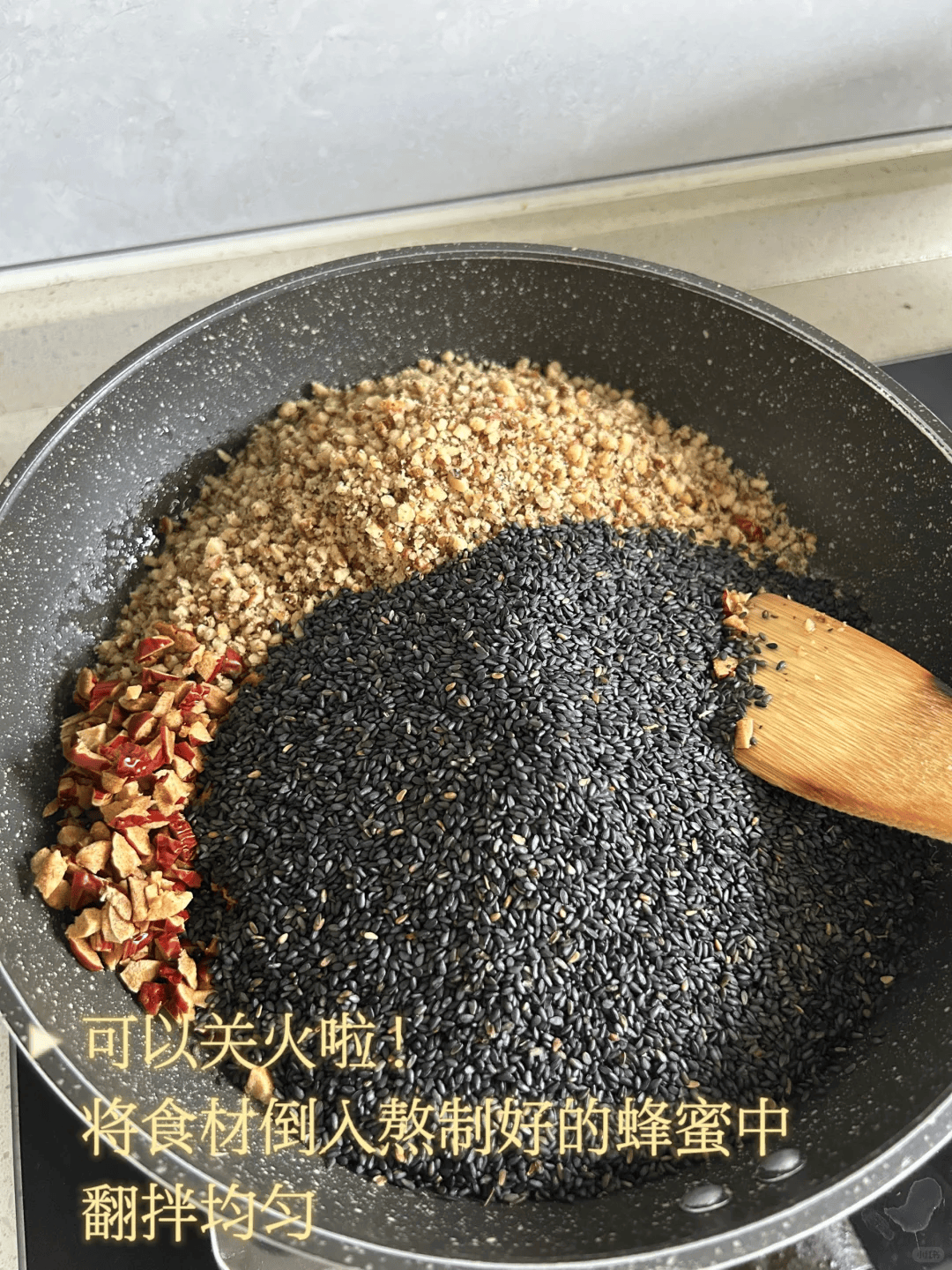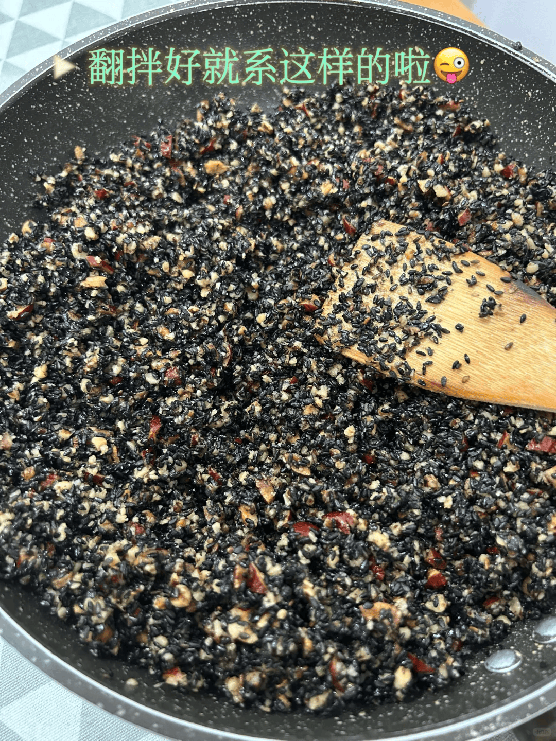 第二步:炒黑芝麻。黑芝麻先洗干净,放在太阳下晒10分钟,晾干水分,然后放进无油的锅里,开中火慢慢炒,炒4-5分钟,直到听到芝麻“噼里啪啦”的炸裂声,立马关火,倒出来放凉,别炒糊了,炒糊就发苦,影响口感。