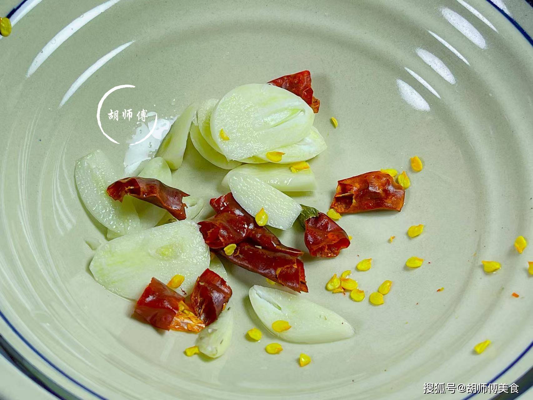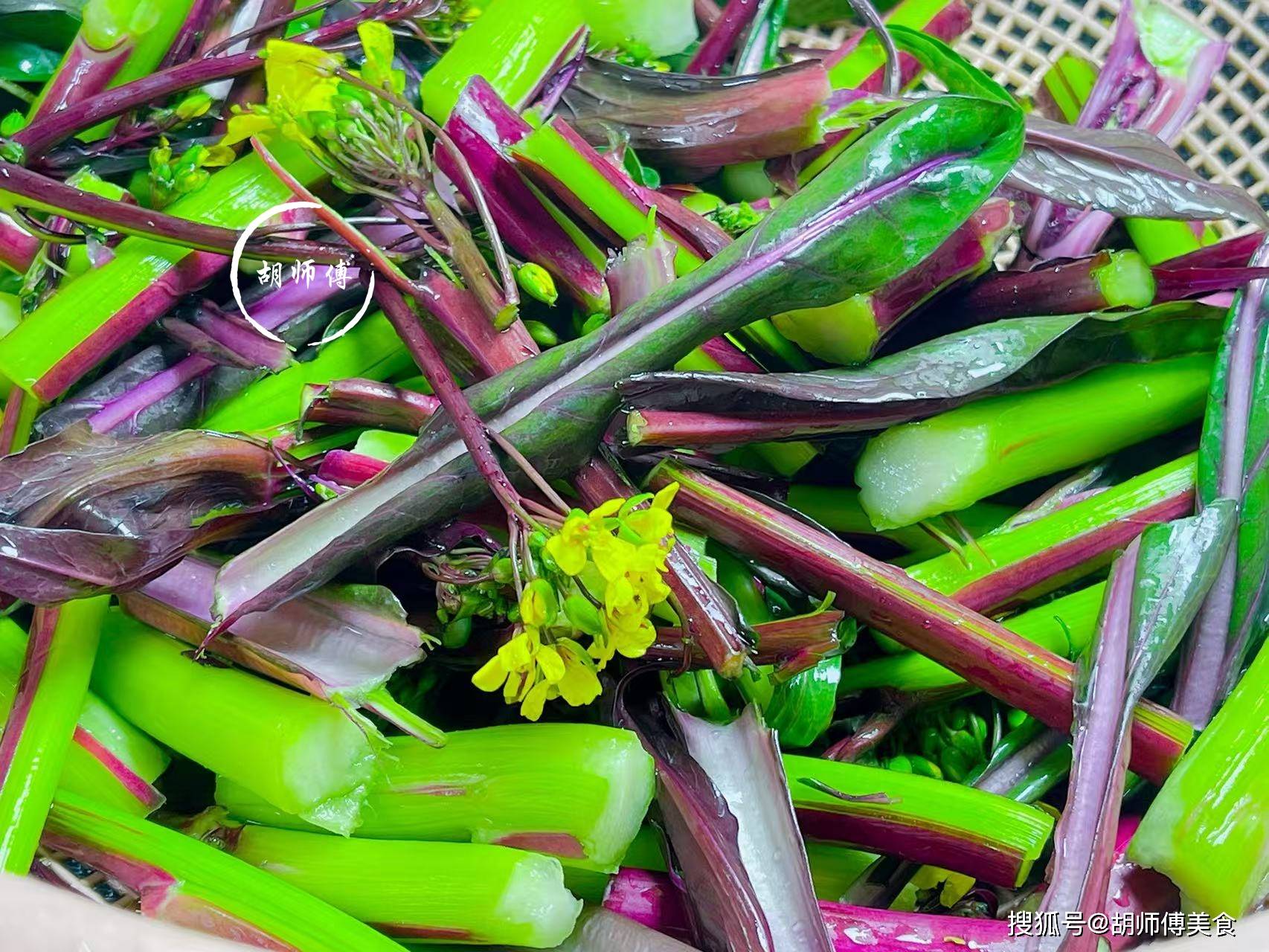 【食材准备】:红菜苔1斤、蒜瓣10克、干辣椒5克、猪油、食盐、鸡精、老陈醋适量。