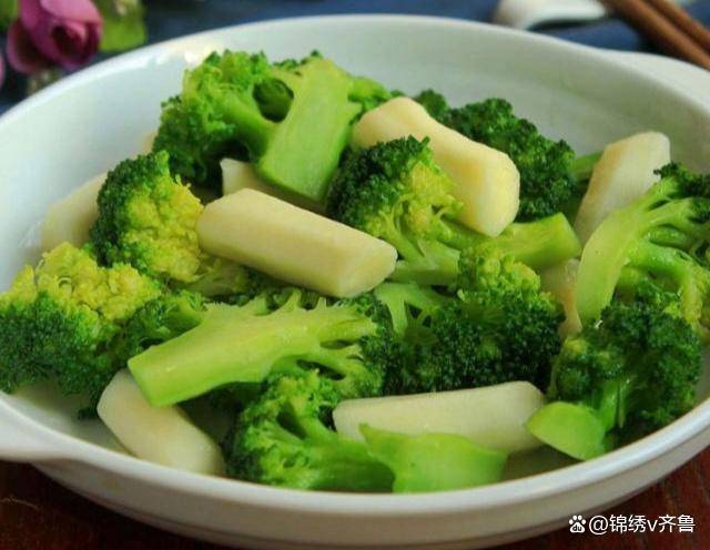 3. 锅中倒油,油热后放入山药片翻炒,再加入西蓝花和胡萝卜继续翻炒,加盐、鸡精调味,翻炒均匀即可。