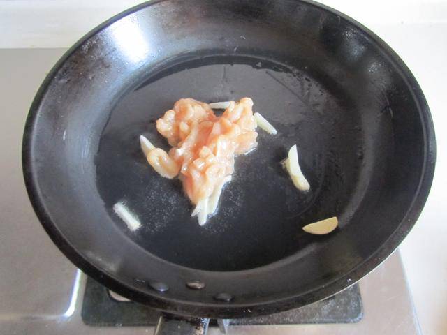 2.烧热锅放入适量的油,将腌制好的肉丝放进锅中翻炒至变色;