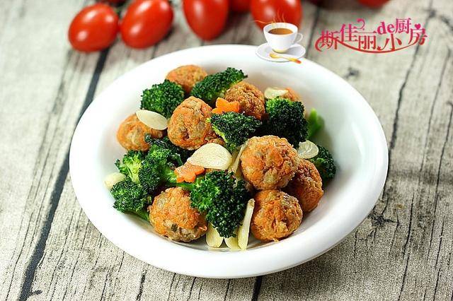 推荐菜谱【西兰花炒胡萝卜丸子】 原料: 胡萝卜 西兰花 肉馅 料酒姜末 蒜 生抽 淀粉 油盐