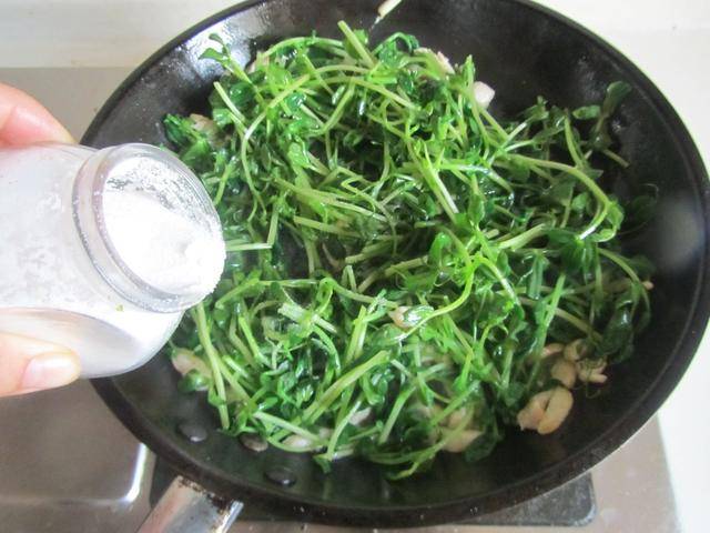 3. 将洗净的豆苗放进锅中翻炒几下至微微变色,再加入少许盐调味,翻炒均匀后盛入盘中。