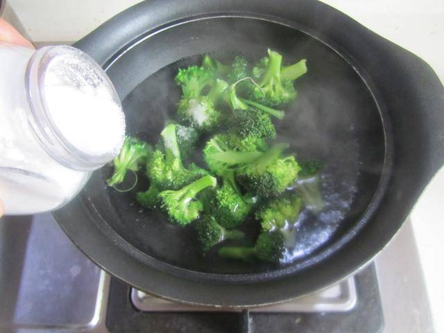 3.烧锅水加入几滴油和少许盐,将洗净摘成小朵的西兰花放进锅中焯烫变色后捞出备用;