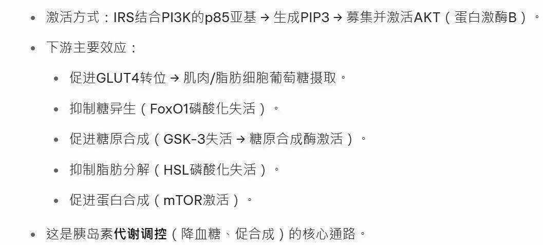 (1)PI3K–AKT 通路:上述作用主要依赖这条通路,这也是胰岛素最核心最重要的通路,是胰岛素的“主干道”。