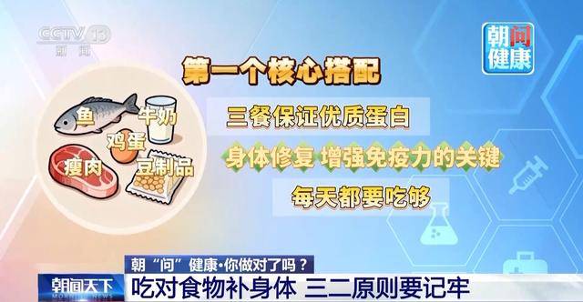第一个核心搭配:三餐保证优质蛋白,像鱼、瘦肉、鸡蛋、牛奶、豆制品,这些是身体修复、增强免疫力的关键,每天都要吃够。