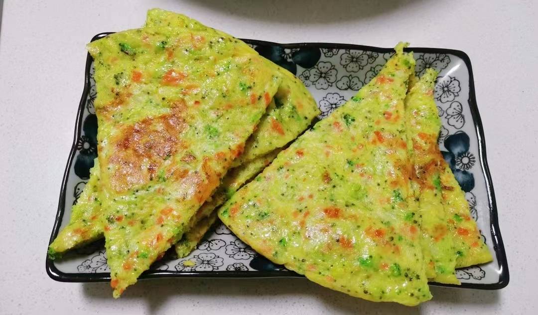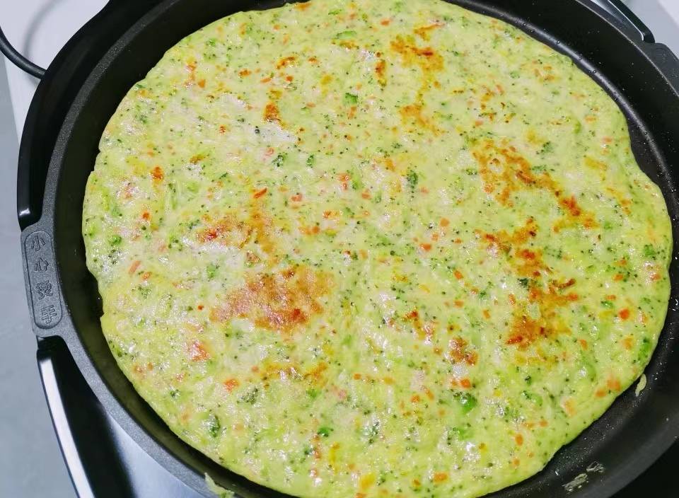 5、在电饼铛里刷一点点油,其倒进去,硅胶铲将其刮薄摊匀。盖住加热,两分钟后就熟。盛出来切小块,摆在盘子里上桌,软软的小饼,吃起来清香美味,春天的早餐太适合了。