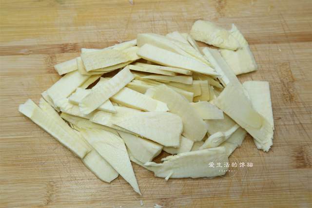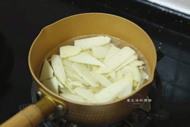 烧开一锅清水,把笋片放入水里焯水2分钟再捞出来,浸泡一下冷水后捞出沥干水份备用,这一步可以有效的去掉春笋里的草酸,吃起来不涩嘴也更健康。