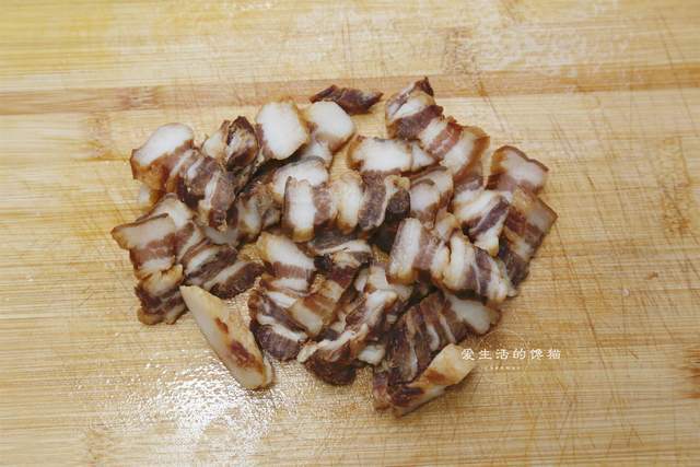 腊肉用热水洗干净表面再切成薄片,我用的是自家腊的腊肉,咸度刚好,要是用的腊肉咸度偏咸,需要浸泡十来分钟去掉多余的咸味再切片。