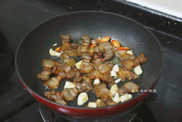 热锅,先把腊肉放入锅里煸出多余的油,等到变得表面微黄干香,就可以放入蒜碎和指天椒段炒香了。