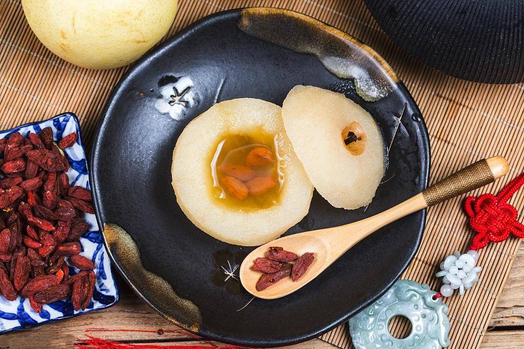 中医认为梨味甘酸性凉,有生津止渴润肺、消燥凉心、消痰降火、解疮毒酒毒之功效。另外,梨还含有丰富的维生素A、B1、B2、C等,能够护肝,促进肝细胞代偿。可以将梨切丝,和京糕条一起做成凉菜,餐中食用,或将梨切片熬成梨汤食用,都可解酒。