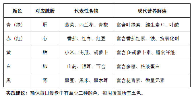 实践建议:确保每日餐盘中有至少三种颜色,每周覆盖所有五色。